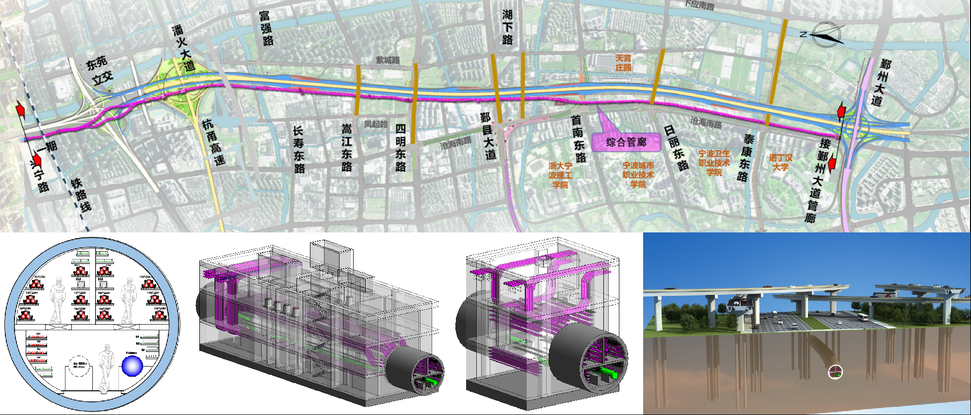 概况:世纪大道南延综合管廊是《宁波市市区地下综合管廊专项规划(2018-2035年)》管廊骨干网络的重要组成部分,是构建我市再生水管环网的主干通道,项目的建设为110千伏世纪变网架优化工程提供廊道,满足再生水利用互联互通建设需求,释放沿线土地资源。项目位于鄞州区,北起兴宁路,南至鄞州大道,长度约为7km。主线采用外径6.7米或3.5米圆形盾构断面,总投资约14.28亿元,规划预留高压电力、低压电力、通讯、再生水等入廊管位。