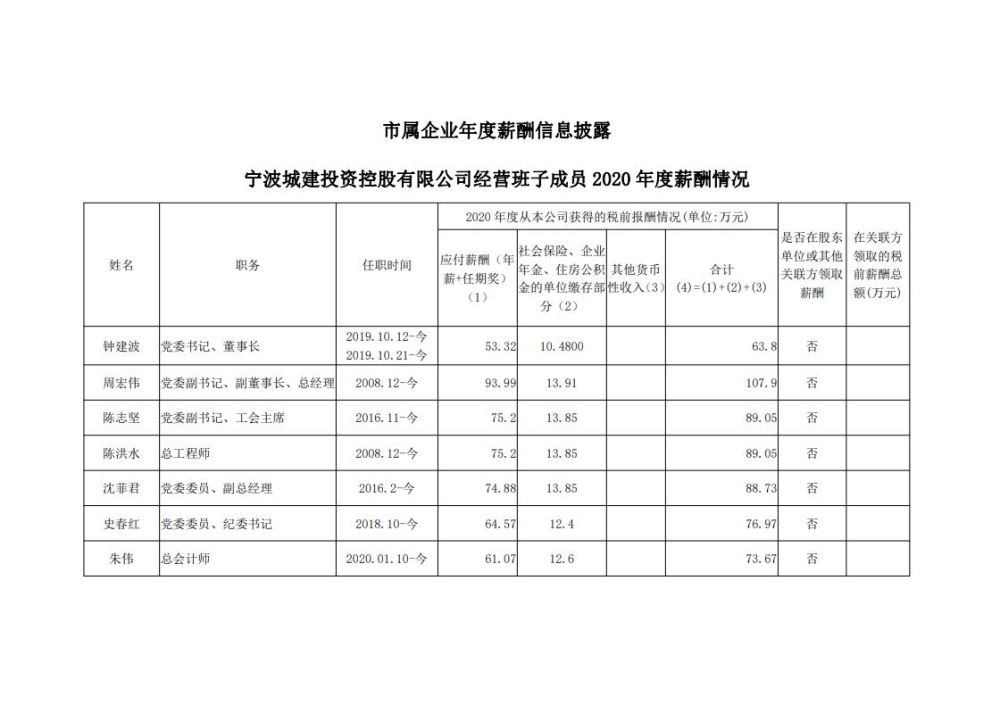 城投公司经营班子成员2020年薪酬情况