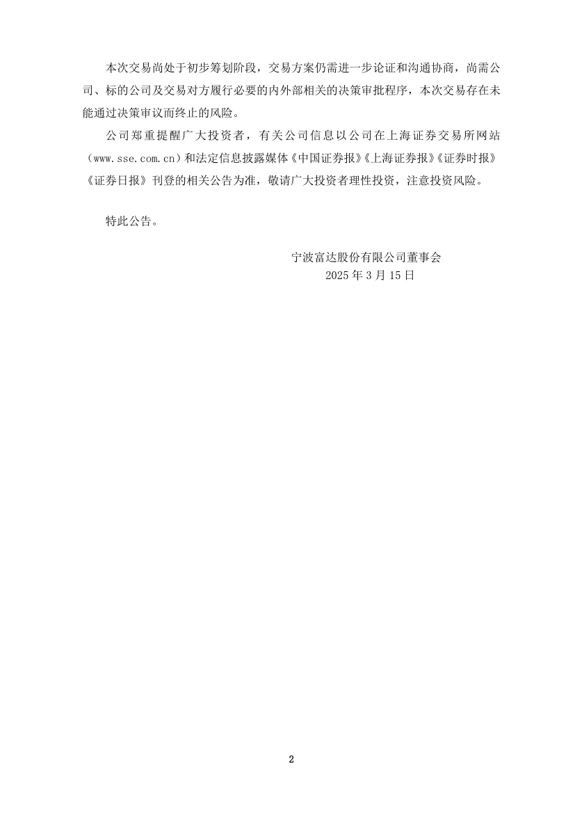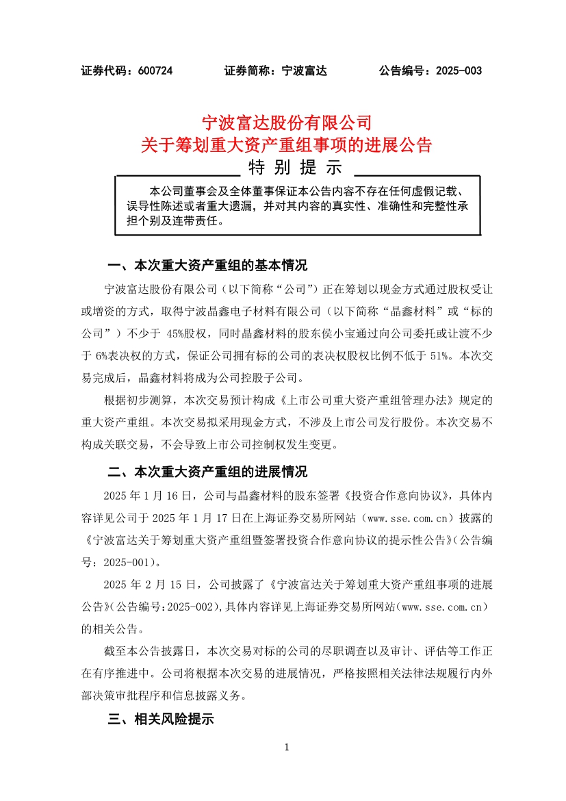 宁波富达股份有限公司关于筹划重大资产重组事项的进展公告