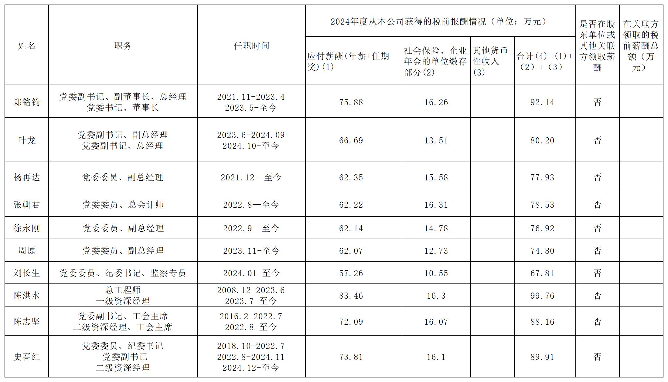 宁波城建投资集团有限公司经营班子成员2024年度薪酬情况