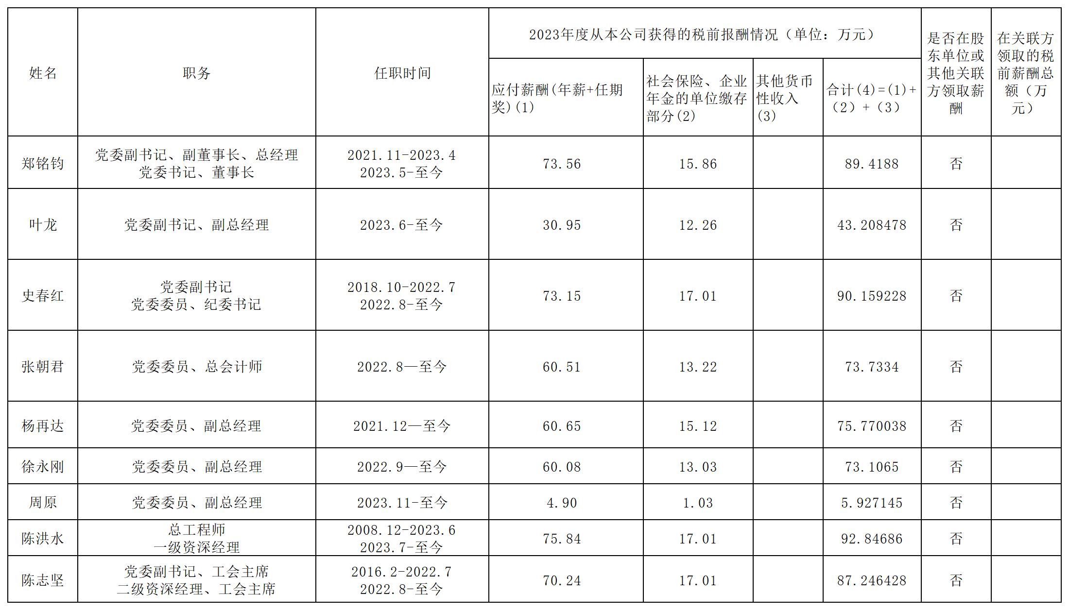 宁波城建投资集团有限公司经营班子成员2023年度薪酬情况